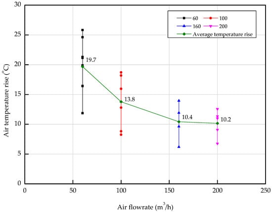 Effect of the air flow rate on the rise in air temperature between inlet and outlet.
