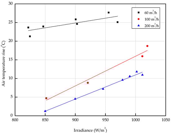 Effect of solar irradiance on air temperature rise between inlet and outlet for different air flow rates.