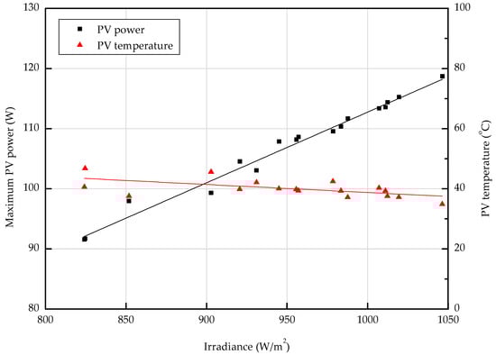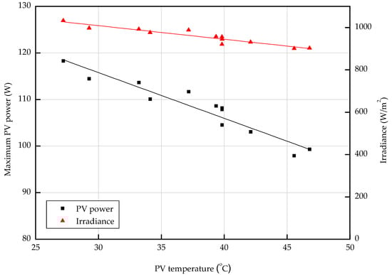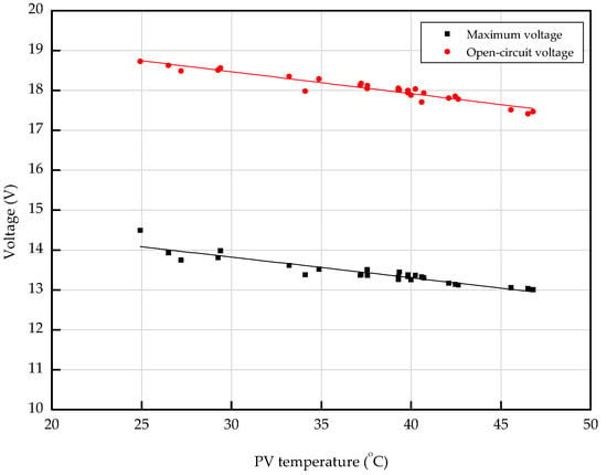 Figure 8 illustrates the effect of solar radiation on the PV module power and surface temperature. The graph shows that the air-based PVT collector increased the output of the PV module as the solar irradiance increased, like a normal PV module. In the case of a PV module, the surface temperature of the PV module increases when solar radiation increases [19]. On the other hand, for the PVT collector, the surface temperature of the PV module was maintained or reduced, depending on the operating conditions, even if the solar radiation was increased. Figure 9 shows a graph of PV power and solar radiation with the PV module surface temperature. From Figure 9, the PV power decreased as PV module temperature increased. Figure 10 shows a graph showing the open-circuit voltage and maximum voltage according to the temperature of the PV module. Figure 10 indicates the reason for power reduction due to the temperature rise of the PV module. The results show that the higher the temperature of the PV module, the lower the PV voltage. As the temperature of the PV module increased, the PV voltage decreased, and in effect the PV power generation decreased. Figure 9 shows that the PV temperature was maintained well below 30 °C when the solar radiation was more than 1000 W/m2 and the PV power generation was about 120 W. Even when the PV module power was close to the standard test condition (STC) condition of 123.3 W, the PV temperature was kept below 30 °C. In the case of a normal PV system, the nominal operating cell temperature (NOCT), which is an index indicating the temperature of the PV module, is 40 °C or higher when a general PV module operates (with a solar radiation of 800 W/m2, outdoor temperature of 20 °C, and wind speed of 1 m/s) [20,21]. In the PVT system, the temperature of the PV module was analyzed to be about 10 °C lower than NOCT of the general PV module, depending on the given operation condition. The experimental results show that the air-based PVT collector has a different surface temperature and power generation than that of the PV module, depending on the operating conditions of the fluid temperature. Therefore, it can be inferred that the PVT system can prevent the increase of the surface temperature of PV module according to the operating conditions, thereby preventing the power decrease due to the temperature rise.