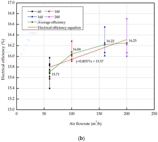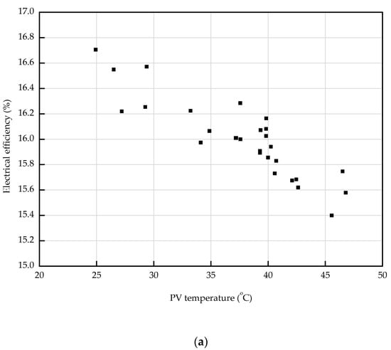 where , , , , and are the electrical efficiency (-), maximum current (A), maximum voltage (V), area of the PV cell (m2), and global solar radiation (W/m2), respectively. The electrical efficiency of the PVT collector was confirmed by the decreasing trend as the PV temperature rose, as shown in Figure 11a. The increase in PV temperature caused the reduction in PV electrical efficiency. Figure 11b shows the effect of flow rate on the electrical efficiency of the PVT collector. From the graph, the electrical efficiency and inlet flow rate of the PVT increase concurrently. When the flow rate was 60 m3/h, the average electrical efficiency of the PVT collector was 15.7%, but the average electrical efficiency increased to about 16.3% at an inlet flow rate of 200 m3/h. The reason why the electrical efficiency increased with the increase of the inlet flow of the PVT collector can be deduced from Figure 12, which shows a temperature graph of the PV module against the inlet flow rate of the PVT collector. Figure 12 shows that the average temperature of the PV module decreased to 42.07–33.64 °C as the inlet flow rate of the PVT collector increased to 60–200 m3/h. When the inlet flow rate of the PVT collector increased to 60–200 m3/h, the temperature of the PV module decreased by 8.43 °C, and the electrical efficiency increased by 0.6%. Subsequently, the increased inlet flow rate of the PVT collector in turn increased the internal flow velocity, causing the decreased temperature of the PV module. The experimental results thoroughly confirm that the flow rate and temperature of the inlet can affect not only thermal performance, but also the electrical performance of the PVT collector.