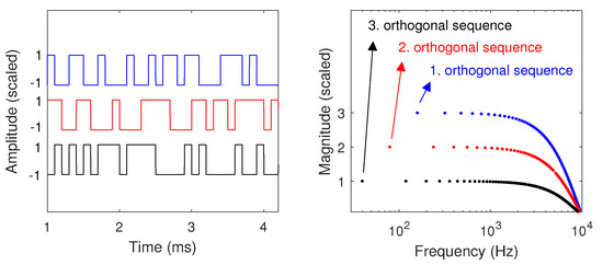 The synthesis of orthogonal (periodic) binary sequences has been well documented [13]. One of the most popular techniques is to apply a Hadamard modulation [6]. In this method, the maximum-length binary sequence (MLBS) is used as a base signal. The second signal is obtained by adding, modulo 2, the sequence 0 0 1 1 0 0… to the MLBS. The third signal is obtained by adding the sequence 0 0 0 0 1 1 1 1 0 0 0 0… to the MLBS, and so on.