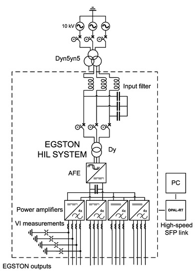 The experimental tests were carried out at DNV-GL Flexible Power Grid Lab, Arnhem, which includes a power hardware-in-the-loop (PHIL) setup, shown in Figure 4. The combined power of the four power amplifier groups is 200 kVA. The four power amplifiers are digital power amplifiers manufactured by Egston. Control systems were implemented using the OPAL-RT real-time digital simulator, which includes the Xilinx Virtex-7 FPGA VC707, for fast digital computation and signal processing. Each of the digital amplifiers comprised of four single-phase units (a total of 16 units in the whole PHIL setup) with a closed-loop bandwidth of approximately 5 kHz [15]. Each single-phase amplifier comprised of six interleaved parallel half-bridge converters with an equivalent switching frequency of 125 kHz. For the closed-loop PHIL setup, the high-speed SFP communication link was established between the OPAL-RT and Egston. The current and voltage measurements were updated from the amplifier output terminal to OPAL-RT every 4 microseconds, while current and voltage control set point values were sent to the Egston digital I/O box. The host PC was connected via asynchronous ethernet to the OPAL-RT target PC. The single-phase amplifiers were isolated from the main grid by a Dy transformer. Thus, the amplifiers can be freely configured to act as sources or loads, DC or AC, depending on the needs of the PHIL study. Each amplifier can be configured to emulate the impedance behavior of a real grid-connected converter, as discussed in [15].