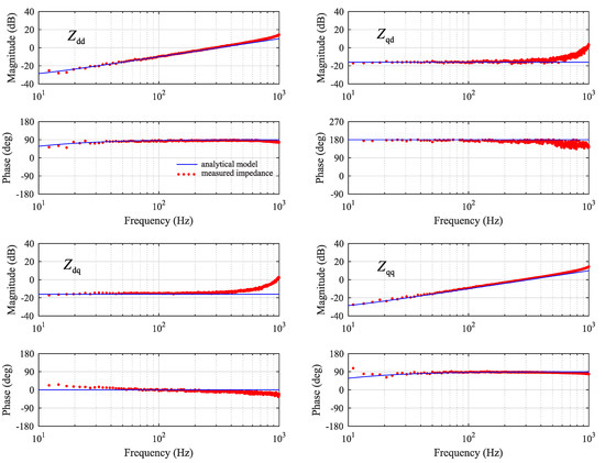 Figure 13 shows the identified impedance with parallel current-controlled converter. In the case of all impedance components, the magnitude is accurately identified, which is due to fact that the output impedance of converter G2 is much higher than that of the grid impedance. The output inductance of G2 was 3.2 mH, which is 6.4 times higher than the grid inductance. Interestingly the parallel converter improves the phase-accuracy of the cross-coupling components, presumably by altering the way injection from d-component leaks to q-component (and vice versa). However, the phase of the direct and quadrature components and are slightly deteriorated. The maximum error is approximately 13 degrees at 600 Hz.