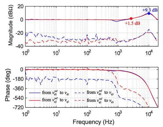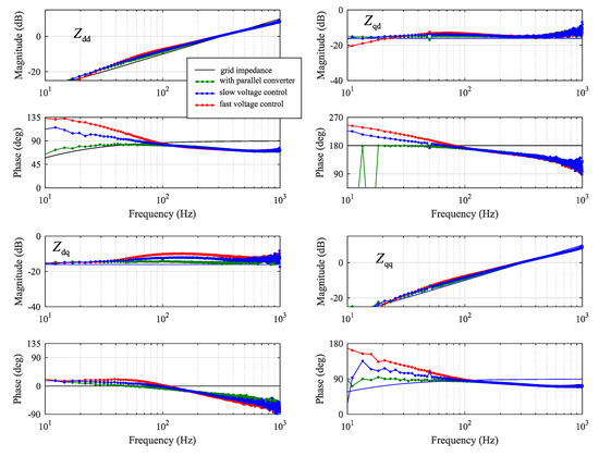 The identified grid impedance in the presence of a parallel current-controlled converter with voltage support function is shown in Figure 14. The effect of voltage support dominates the impedance in the low frequency range. The phase-error at high frequencies is still evident in the direct component , which is caused by insufficient decoupling in the current control of converter G4. However, now also the phase at low frequencies has large error due to voltage control. Fast voltage control causes significant phase-lead in the direct component within its bandwidth. The same behavior is observed in cross-coupling component and quadrature component . The cross-coupling component has the least effect on its phase. However, the magnitude has error around middle frequencies, which was also found to be affected by the low-pass filter. Decreasing the cutoff frequency of the low-pass filter would improve the magnitude–accuracy of component .