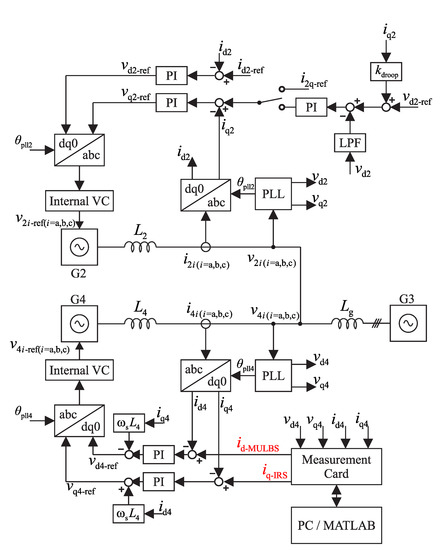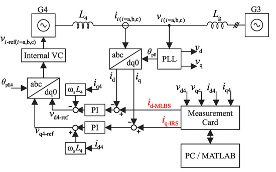 Grid impedance was measured in the dq-domain using amplifier group number 1 (G1) in current amplifier mode. During the measurement, both amplifier groups 2 and 4 (G2 and G4) remained disconnected. The grid impedance is measured by applying two orthogonal signals (the MLBS and IRS signals) into d and q references of the current amplifier, as illustrated in Figure 5, and by using Fourier methods to compute the frequency responses. Frequency responses were computed offline utilizing measurement cards and a PC running MATLAB software. The impedance components are extracted from the measured d and q-components as follows: