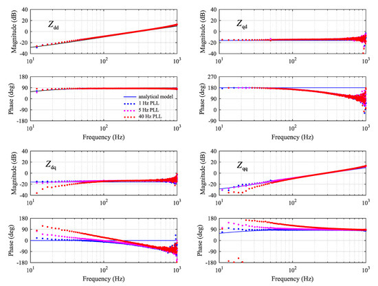 Impedance components extracted using the emulated inverter as an excitation source with different phase-locked-loop (SRF-PLL) crossover frequencies.