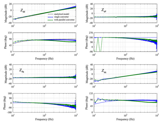 - A parallel current-controlled converter causes slight phase-error of the direct and quadrature impedance components and . However, the cross-coupling components and are more accurately identified. The effect could be counteracted by optimizing the decoupling gains inside the current controller of the inverter that is supplying the injection.