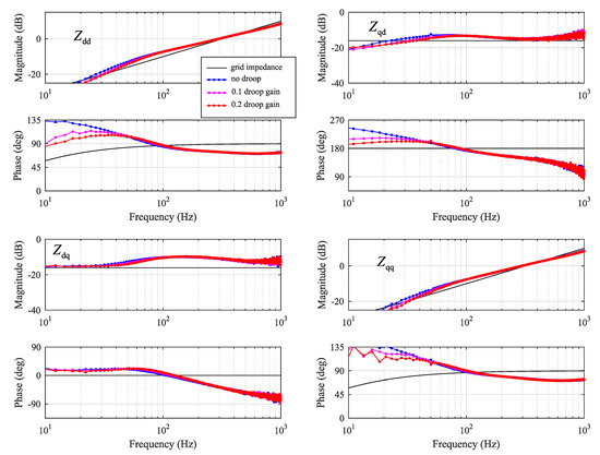 The voltage controller was left at the fast setting and droop gain was varied between zero and 0.2. The identified impedance components are shown in Figure 15. The higher the droop gain, the less effect the voltage control has on the identified impedance. The phase-error is clearly reduced in impedance components , , and when the value of droop gain is increased. The effect can be understood by considering the purpose of the droop gain, that is, it reduces the effect of voltage control on the grid voltage at the interface point. Thus, with higher droop gain, less error is introduced in the identified grid impedance.