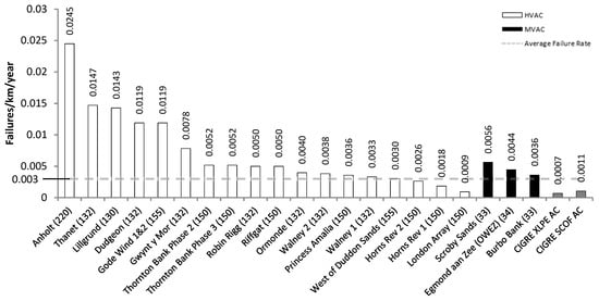 From the graph in Figure 2, it would appear that the failure rates experienced by cables in the medium voltage (10–66 kV) region is comparable to that experienced across HVAC (110–245 kV) ratings. However, it must be considered that many of these sites have been operational for a number of years more than those with higher capacities and higher cable ratings.