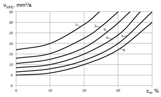 Influence of water concentration in water–fuel emulsion on its viscosity at different temperatures. 1: tWFE = 40 °C, 2: tWFE = 50 °C, 3: tWFE = 60 °C, 4: tWFE = 70 °C, 5: tWFE = 80 °C, 6: tWFE = 100 °C.