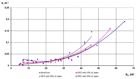 - At low loads, smoke concentrations in exhaust gases varied slightly, depending on the water quantity in the emulsion, and, at high loads, smoke concentration increased. For diesel fuel, the level of 0.19 m−1 was determined at Ne = 65 kW; for the emulsion with 10% water—0.16 m−1 at 57 kW; for the emulsion with 20% water—0.09 m−1 at 46 kW; for the emulsion with 30% water—0.15 m−1 at 46 kW.