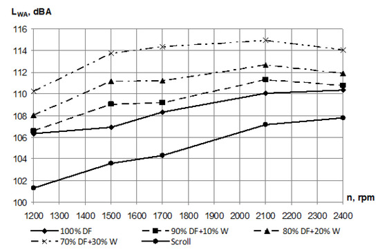 According to Figure 8, the sound power level for all the WFE compositions increased when the engine speed grew, due to an increase in the amount of energy per unit of time, which caused the engine to oscillate. The maximum sound power for all the WFEs was achieved at 2100 rpm and did not correspond to the full power mode (2400 rpm), as in case of pure diesel fuel. In this case, the lowest noise corresponded to pure diesel fuel, and the highest to the mixture of 70% diesel fuel and 30% water; that is, the noise increased when the proportion of water in the mixture grew. This can be explained by an increase in the ignition delay period at the same injection advance angle. At the same time, more fuel is supplied to the cylinder during the ignition delay period. This leads to an increase in pressure growing rate. This in turn leads to an increase in engine noise, as the speed of the vibrations of the outer surfaces of the engine increase.
