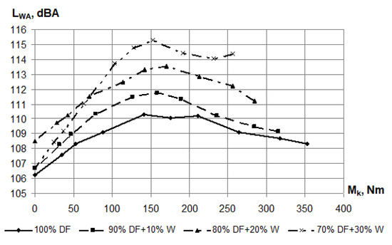 As shown in Figure 9, the maximum noise emitted by the diesel engine at an engine speed of 1700 rpm, for all types of fuels, corresponded to the range of 40%–70% of the maximum torque. A similar pattern was observed for the other engine speeds. This can be explained by the settings of the injection advance angle and the fuel supply characteristics in the engine operation modes.