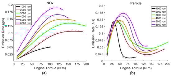 Appendix A. The data points of particle are marked as 20 red plus dots; those of NOx are marked as blue cross dots. Considering the complete WLTP test cycle, the calculation results of each time step add up to the integrated FC in L/100km and total emissions (i.e., NOx emissions in grams and particle emissions in SBV). As shown in