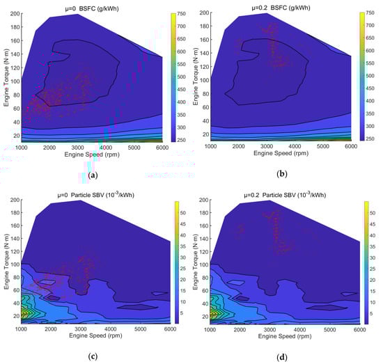 Figure 11a,b, it can be concluded that the distribution status of brake specific fuel consumption (BSFC) values of all operating points fails to change significantly with
