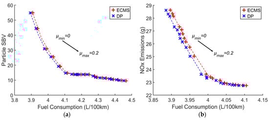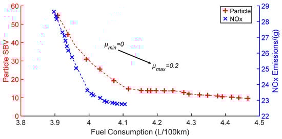 for both exhaust pollutants. By analysis of the curve trend, it is clear that there exists a trade-off relationship between fuel economy and emission performance, whether it is for NOx or particle. As the weighting coefficient