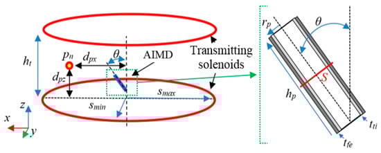 Sketch of a generic cylindrical active implantable medical device (AIMD) with a rotation θ between the excitation and the device coil axes.