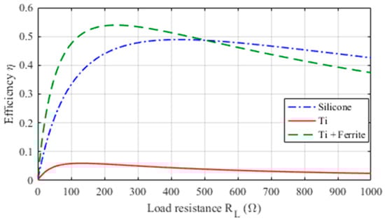 In order to investigate the influence of the load on the WPT performances, the analysis of the efficiency is carried out by varying RL in the range 0–1000 Ω for the three considered test cases. The obtained results are shown in Figure 14, highlighting as these WPT systems can operate very well for a wide range of RL values.