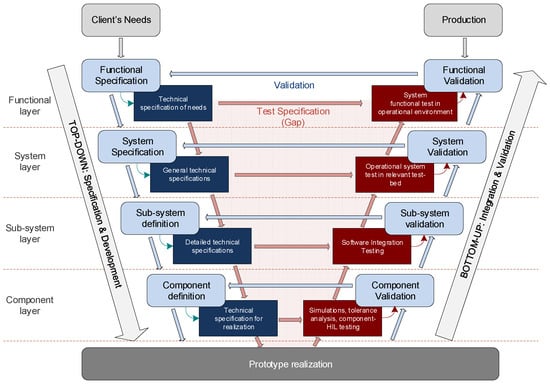 The relation between system requirements and test specification, as well as their widening specification gap, is also visible in this illustration of the V-model. This specification gap appears at higher levels of integration, and is amplified when the test involves the integration of several domains with fundamentally distinct natures (e.g., power system and ICT).