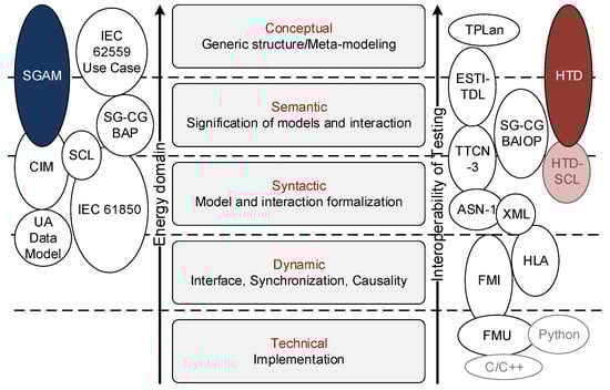 Common to both semantics, i.e., (1) and (2), is the sequence of abstraction layers, which can be interpreted in a top-down view from purpose-oriented to implementation-oriented. The layers are listed in Figure 2 along with related standards from the energy system context (left) and testing context (right). In the following, we introduce the left and right side of Figure 2. The complexity and semantics of test technologies, i.e., Gap (iii), is discussed in the next section.