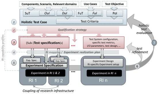 The Qualification Strategy is the place for outlining how the qualification goals (as defined in Test Case) are to be met by a combination of experiments. This step is recommended for more complex experimental designs, such as a plan for round-robin testing, for cross-validation of simulation results, or a validation sequence involving both simulated and physical experiment setups []. Examples reported in [,] explicitly address assessment of testbed characteristics as intermediate step in system testing.