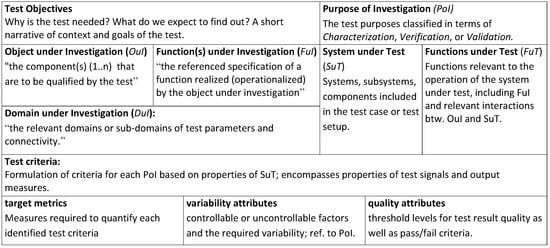 The Test Case structures the motivation for a test. By combining narrative, with graphical, qualitative, structured and quantitative/formal elements, domain specifics are given a shared testing context. In Figure 4, the TC template elements are summarised. We can identify three main parts: firstly, The Test Objectives in narrative form, and their more analytical form as Purpose of Investigation (PoI); secondly, the description of system functions and components to organise the System under Test (SuT) and its functions, and isolate the focal points of the investigation; and, finally, the Test Criteria, which present a further formalisation of the test objectives in terms of measurands of performance and behavior.