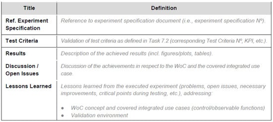 For its use in ELECTRA IRP, an additional element was added to the HTD for reporting each of the experiment accomplished. The Experiment Reporting was also based on a template. The information in the Experiment Reporting template was intended to assess the validation of the Test Criteria corresponding to the Experiment Specification. It was also planned for extracting the main conclusions from the testing concerning the results, lessons learnt and open issues. The Experiment Reporting Template can be seen in Figure 8.
