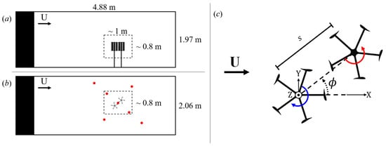 The mean freestream speed measured in the particle tracking measurement domain, illustrated in Figure 1a,b, was 5.6 ± 0.3 m/s, resulting in a Reynolds number based on the turbine diameter of approximately . At this freestream speed, the two turbines freely rotated at rotational rates of rev/s and rev/s. This free-spinning case (i.e., no load) was used for all experiments and corresponds to a tip-speed ratio for the turbines of and . This tip-speed ratio was defined for all experiments using the free-stream flow velocity in the wind tunnel (), which, being a far-field measurement, is a more reliable metric for comparisons than the flow conditions immediately upstream of each turbine. This tip-speed ratio matches the optimal tip-speed ratio for the full-scale 2-kW VAWTs at the FLOWE field site, a result shown both in field data and in laboratory experiments at full dynamic similarity [36]. Such low tip-speed ratios are characteristic of turbines with relatively high solidities (e.g., [37]), since the optimal tip-speed ratio for VAWT operation decreases with increasing solidity [38,39,40,41]. The application of the results shown in this paper to turbines with lower solidity (e.g., [42]) is discussed in more detail in Section 4.