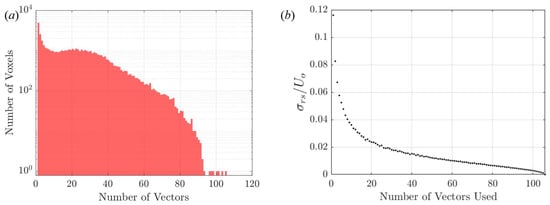 (a) Distribution of number of vectors per (2 cm)3 voxel in the freestream measurement with an empty test section. (b) Standard deviation of the means of calculated from 2000 re-samplings of data () versus the number of vectors used in the re-sampling. Data are from the voxel with the most vectors in the freestream measurement.