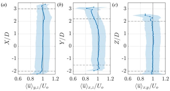 To characterize the wind tunnel freestream, 3D-PTV measurements were recorded with an empty test section. Three profiles of the normalized streamwise velocity are plotted in Figure 3. The observed standard deviations correspond to the turbulence intensity in the tunnel, . These profiles were used to determine the maximum extent of the particle tracking domain based on where the flow was sufficiently uniform. Additionally, the discontinuities at the edges of the domain are caused by relatively fewer vectors passing through the edges of the domain defined by the cameras’ mutual field of view.