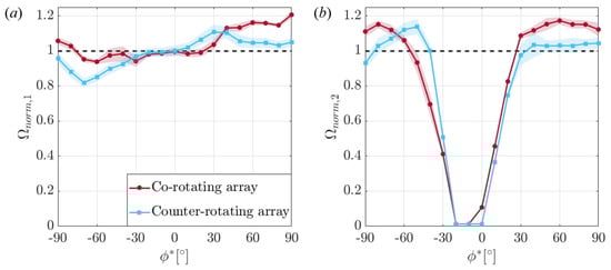 Normalized performance of (a) Turbine 1 and (b) Turbine 2 versus adjusted array angle () for a turbine spacing of . Error bands represent plus or minus one standard deviation from the mean measurement.