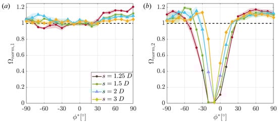 Normalized performance of (a) Turbine 1 and (b) Turbine 2 versus adjusted array angle for turbine spacings of , , , and in a clockwise, co-rotating array. Error bands represent plus or minus one standard deviation from the mean measurement.