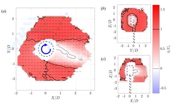 Contours of the normalized time-averaged streamwise velocity () around a clockwise rotating VAWT at the planes: (a) ; (b) ; and (c) . The grey and black contour levels denote and , respectively. The dashed black lines denote the projection of the turbine on the plane. The overlaid vectors denote the in-plane velocity. Vectors are shown at 25% of the recorded resolution for visual clarity. The direction of the VAWT rotation is denoted by the blue arrow. The empty regions in the immediate vicinity of the turbine represent zones in which particles were not able to be tracked in multiple camera views.