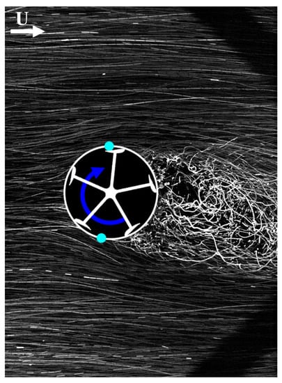 Particle trajectories of neutrally buoyant HFSB tracers around a clockwise rotating VAWT. Particle trajectories are only visualized between . The rotor projected on the image is in an arbitrary orientation and the white circle denotes the boundaries of its rotation. The direction of the rotor rotation is denoted by the blue arrow. The cyan dots denote the position where the trajectories “detach” from the rotor.
