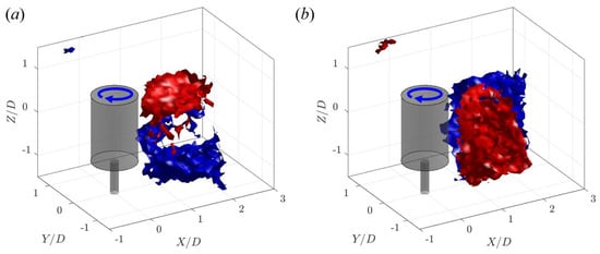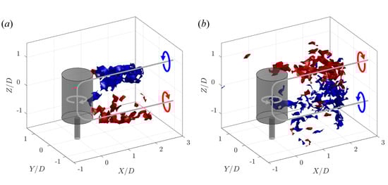 Isosurfaces of the streamwise vorticity () around a clockwise and counter-clockwise rotating VAWT can be seen in Figure 8. The isosurface value of represents the vorticity expected to be shed based on the dynamic characteristics of the turbine (cf. [31,61]). These structures extend from the top and bottom of the rotors and propagate downstream. Similar structures were observed by Ryan et al. [31], who demonstrated that at a higher tip-speed ratio the strength of these structures increases. This study adds to previous work by observing that these structures are symmetric in their streamwise spatial extent when sufficiently far from any tunnel boundaries. Additionally, the differences in Figure 8a,b demonstrate that the rotational orientation of these structures are dependent on the rotational orientation of the turbine. While data were not collected directly adjacent to the rotor, the sign of the vorticity in these wake structures suggests that they originate from the vorticity imparted to the flow by the spinning rotor. As this vorticity extends beyond the rotor it is bent by the flow and aligns with the direction of the freestream. This linked U-shaped vortical structure is illustrated by the grey vortex lines and rotational arrows drawn on Figure 8.