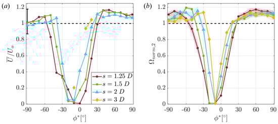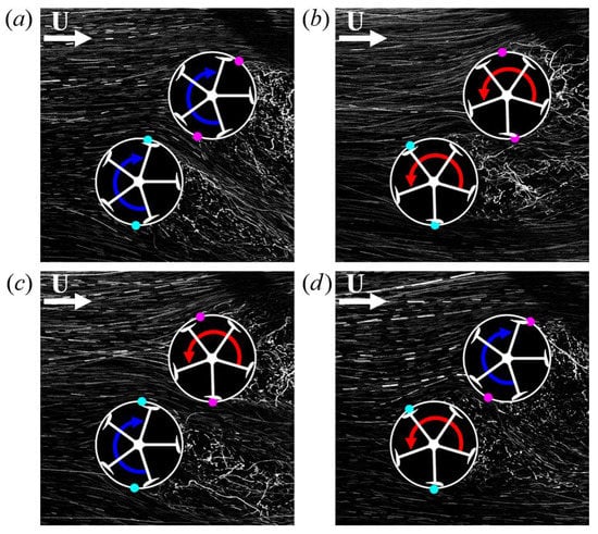 Using this setup, three-dimensional velocity measurements were collected for the freestream flow, a single turbine, and for turbine pairs. These data were recorded over eight- or ten-minute measurement periods, resulting in approximately 4000–5000 turbine rotations. For the single turbine, data were collected for both clockwise and counter-clockwise orientations. Due to the symmetry between these experiments and the offset measurement domain, the results were combined into a single dataset with a larger effective measurement domain. For the turbine pairs, a single turbine spacing and array angle were studied ( and ) for all four combinations of rotational configurations (i.e., clockwise co-rotating, counter-clockwise co-rotating, reverse doublet, and doublet). According to conventions established in the wind-turbine literature (e.g., [14,52]), the rotational configuration is defined to be a doublet when the blades between the rotors are advancing upstream and a reverse doublet when the blades between the rotors are retreating downstream. These cases were isolated because they lay in the s-ϕ regime where significant performance enhancement was observed, so that the flow mechanisms responsible for these enhancements could be identified.