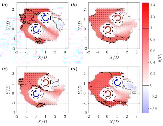Contours of the normalized time-averaged streamwise velocity () around: (a) clockwise co-rotating; (b) counter-clockwise co-rotating; (c) reverse doublet; and (d) doublet arrays at the plane . The arrays have a turbine spacing of and are at an array angle of . The grey and black contour levels denote and , respectively. The dashed black lines denote the projection of the turbine on the plane. The overlaid vectors denote the in-plane velocity. Vectors are shown at 25% of the recorded resolution for visual clarity. The direction the individual VAWT rotations are denoted by the blue (clockwise) and red (counter-clockwise) arrows. As in Figure 6, the empty regions around the turbines correspond to locations where particles could not be tracked in multiple cameras.