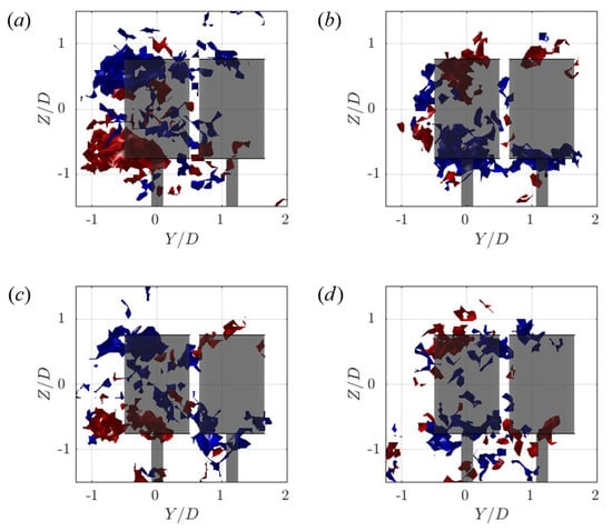 Three-dimensional isosurfaces of the time-averaged streamwise vorticity at the value around: (a) clockwise co-rotating; (b) counter-clockwise co-rotating; (c) reverse doublet; and (d) doublet arrays. The arrays have a turbine spacing of and are at an array angle of . Positive vorticity is red and negative vorticity is blue. The transparent cylinders represent the maximum extent of the rotor and the turbine tower.