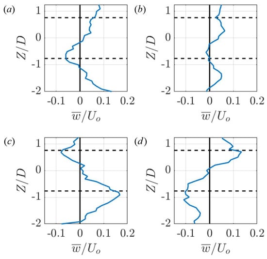 Vertical transects of the normalized time-averaged vertical velocity () at downstream and laterally between the rotors (). Data are shown for: (a) clockwise co-rotating; (b) counter-clockwise co-rotating; (c) reverse doublet; and (d) doublet arrays. The arrays have a turbine spacing of and are at an array angle of . The dashed black lines denote the top and bottom of the rotors in the array. The transects were smoothed using a five-point moving average.