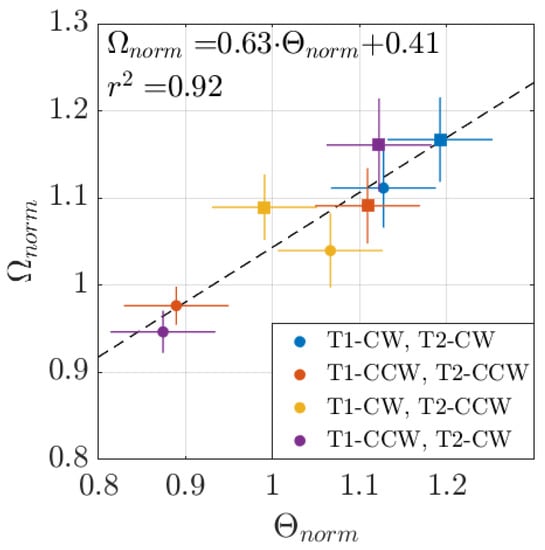 The flow measurements in this study cannot be used to quantify angle of attack or incident flow speed changes on the blades of the rotors due to the lack of resolution of the data at the blade surfaces. However, the near-rotor resolution in the spanwise aggregated particle trajectory images in Figure 7 and Figure 10 can be used to define a surrogate for the modifications in these parameters. In the wake region of the rotor, the flow speeds are too low for significant torque to be produced by the rotor blades. Therefore, the range of azimuthal positions where the flow is “attached” to the rotor () can be used as a rough surrogate for the percentage of the rotor where useful torque is produced. In Figure 10 these points are marked by the cyan dots for the upstream turbines and the magenta dots for the downstream turbines. Using these measurements, the values of for both turbines in the array can be normalized by the range of attached azimuthal positions for the isolated turbine () to give a normalized metric which can be used to approximate the changes in a rotor’s net torque production ().