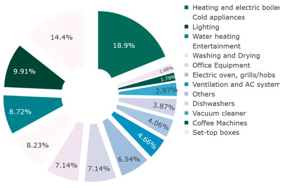 The residential sector’s contribution is approximately 29% in terms of final electricity consumption, when compared to transport, agricultural and forestry, services, and industry []. This provides huge unlocked potential, enabling demand-side management for grid stability through the participation in DR programs. Several barriers have prevented this from happening. The disaggregated nature of the assets (households) and their relatively low size, in terms of providing a significant bid to the market, have posed some challenges. Figure 1 shows typical household consumption share by appliances in the European Union 27 members (EU-27), based on a Joint Research Centre (JRC) report [], which suggest that the majority of the electric energy could be flexible.