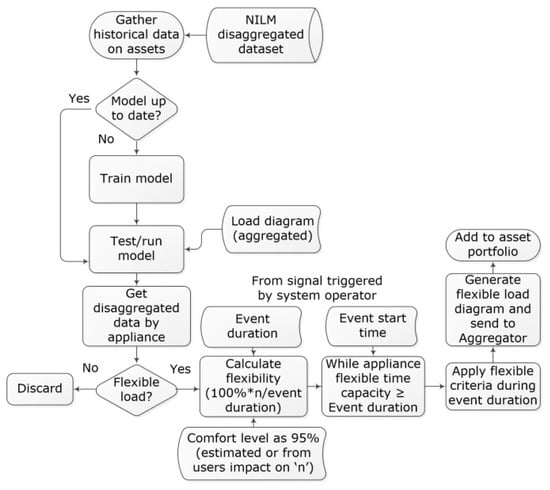 An aggregator can only present its services to the market successfully if their costumers show high levels of participation in DR programs. Furthermore, an aggregator relies on excellent data analytic processes, asset management, and bid strategies to see its bids being cleared, while maximising its revenues. Typical clients or assets may be steel factories, the concrete industry, or hospitals, where a set of chillers or furnaces may easily reach several units of MegaWatt. While not being widely spread, the aggregation activity is not novel, and hence, a growing interest in accessing new loads and diversifying assets and portfolios is arising. Smaller and medium customers have become the targets of interest for such applications, which coupled with larger assets, could form diversified and leaner portfolios to respond to different needs. Even though the estimation of flexibility focusing on specific assets can be found in the literature, an integrated approach is seldom seen. In this study we propose estimation of the flexibility of a typical client’s set of assets, in this case a household. For this, we present an approach that combines non-intrusive load monitoring for data collection, which is used with disaggregation algorithms to train a model for load forecast. This forecast is then subjected to a flexibility criterion proposed in this study, which forecasts the flexibility based on categorization of assets, where the power amplitude variation is presented along with its allowed time correspondence. This linear behaviour between the variation of the loads and the time an asset can endure such variation (based on customers comfort) can be updated by the customer’s feedback. The output flexibility of the studied household can then be grouped with other flexibilities by an aggregator and presented to the market.