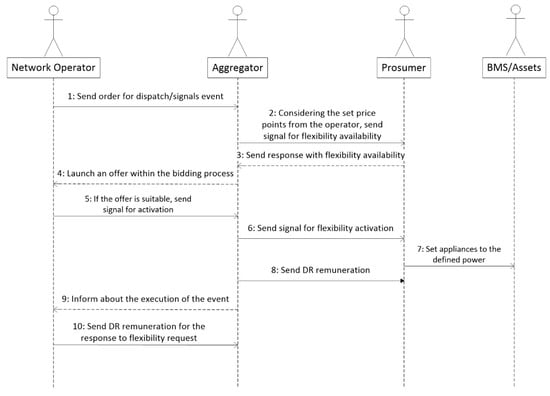 The interactions between the actors can be seen in Figure 3 for a STOR service. The system operator starts by signalling to the aggregator that a demand response will be required in a certain time window. The aggregator, considering an incentive, requests the availability and flexibility forecast of its assets and receives a response. With a response based on the forecast and available assets, the aggregator chooses the bid it makes to the market and waits for the activation order. Once the order is received, a close to real-time order is also given to the client and chosen flexible assets. After the service has been provided the financial settlement is complete.