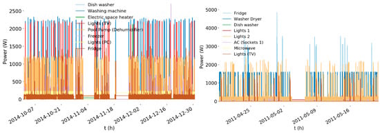 Following this approach has several advantages. First, it allows the household’s occupants to be informed about the energy use of each appliance, empowering them to take actions towards energy optimization. Second, this system can provide comparative information on an appliance’s performance, for example by quantifying the savings when an old, inefficient appliance is replaced by a more efficient one. Third, if the NILM system is able monitor the time of use and pattern of each appliance, implicit demand response signals can be advised by the system to shift the load to a time of day when electricity pricing is more convenient []. However, as mentioned before, collecting data sets is expensive, time consuming, and for a time step of 1 Hz (1 s) may result in large files that are difficult to store or process [].