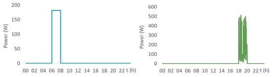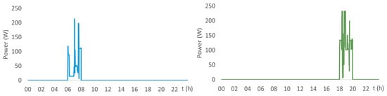 According to Table 1, the STOR program, which is the one being considered for the building participation, allows a maximum of 2 h participation for each asset. Given the daily load profiles of the test for both datasets to be tested and disaggregated, we considered the morning and afternoon periods, where higher electricity use is observed, which are from 06:00 to 08:00 and from 18:00 to 20:00, as can be seen in Figure 8 and Figure 9 for the REDD and Refit datasets, respectively. It is worth mentioning that different programs may have their # recuperation asset times (e.g., 1 day). This means that if an asset is called to participate in an event, it will not be called throughout the day again to participate in DR, to allow any effect caused by the shift or flexibility to be restored. Results show a flexibility maximum power of 200–245 W and 180–500 W for the REDD and Refit datasets, respectively. The stability of the power is, however, cumbersome, as by itself it does not allow a solid bid to be made, even in a minimum time slot of 15 minutes, except for the morning period in Figure 9 (left).