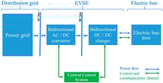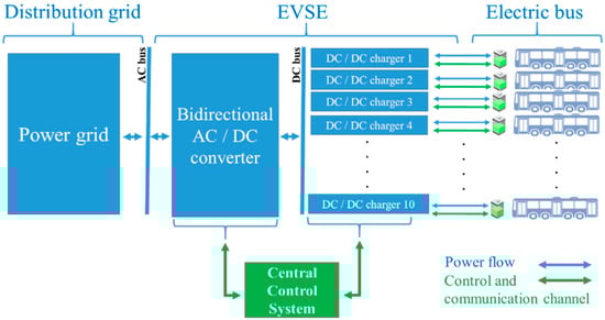 Opportunity charging requires less energy to be stored in the bus, which could significantly reduces the capital costs; however, the cost of the required infrastructure remains very high compared to the overnight charging infrastructure one. Both solutions are competitive in terms of total cost of ownership (TCO) and have their respective advantages and disadvantages []. In this paper, we focus on heavy vehicles (EBs) with overnight charging. Currently, charging mainly overnight is still possible for large-scale EBs fleet. However, in a case where the electricity demand exceeds supply, the charging should be rescheduled or modulated. The proposed optimization tool can handle this issue by imposing constraints from the power grid. The generalized system architecture is presented in Figure 1. The DC/DC charger is managed by a central control system. This controller checks the conversion equipment and carries out the communication with the EB to perform the charging according to a standardized communication protocol (PLC) EN 61851-23 []. A standard socket type Combo 2 CCS makes the hardware connection between the EB and the charger. Further details about the system operation, communication and charging protocol are explained in [,].