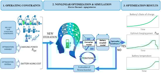 This methodological part describes the approach used to optimize a charging strategy for a fleet of EBs charging overnight as shown in Figure 2. This approach uses nonlinear programming to search for optimality according to the objective function (which is here to minimize the battery aging cost) while taking into account various constraints (actual operating constraints, power grid and the charging station constraints). The optimization methodology has been executed in the Matlab/Simulink environment. Before optimizing the charging process, information is required regarding the number of buses and the operating constraints of each EB: initial state of charge (SoC), initial battery temperature, the target SoC, arrival and departure time, maintenance period.