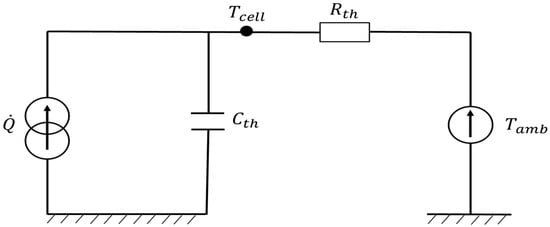 The battery thermal model used is a simple model of a prismatic battery (LiFePO4/graphite) based on an equivalent electrical circuit []. We supposed that the cell temperatures inside the battery pack are homogeneous and that the temperature is identical at the core and at terminals of each battery cell. The studied one-node model shown in Figure 3 contains a quantity Q of heat that is generated by the current source, one-capacity that represents heat accumulation and a thermal resistance that represents convection heat transfers with ambient air. The cooling system is not considered for the moment.