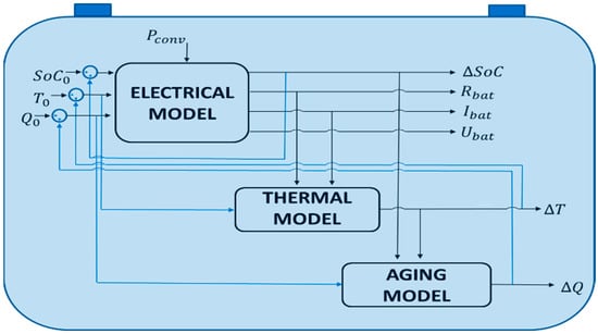 Once the period is over, the variation of SoC, temperature and capacity fade are added to the initial input values. This process is repeated for the next period of simulation. Figure 4 shows the coupled battery model.