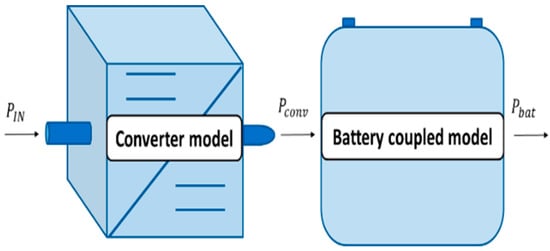 To represent the charger efficiency, a converter model is developed and added upstream of the battery coupled model as shown in Figure 5. The efficiency of an electric vehicle (EV) charger depends on the efficiency of various internal components. Electrical power comes from the grid and is converted several times, from the AC supply to the AC/DC converter and from the DC/DC converter to the battery. In order to stay in an acceptable simulation time, we used some experimental results of charger test efficiency for our converter model to represent the AC/DC and the DC/DC converter power losses []. These data give the average charger efficiency during the charging tests for different charging powers.